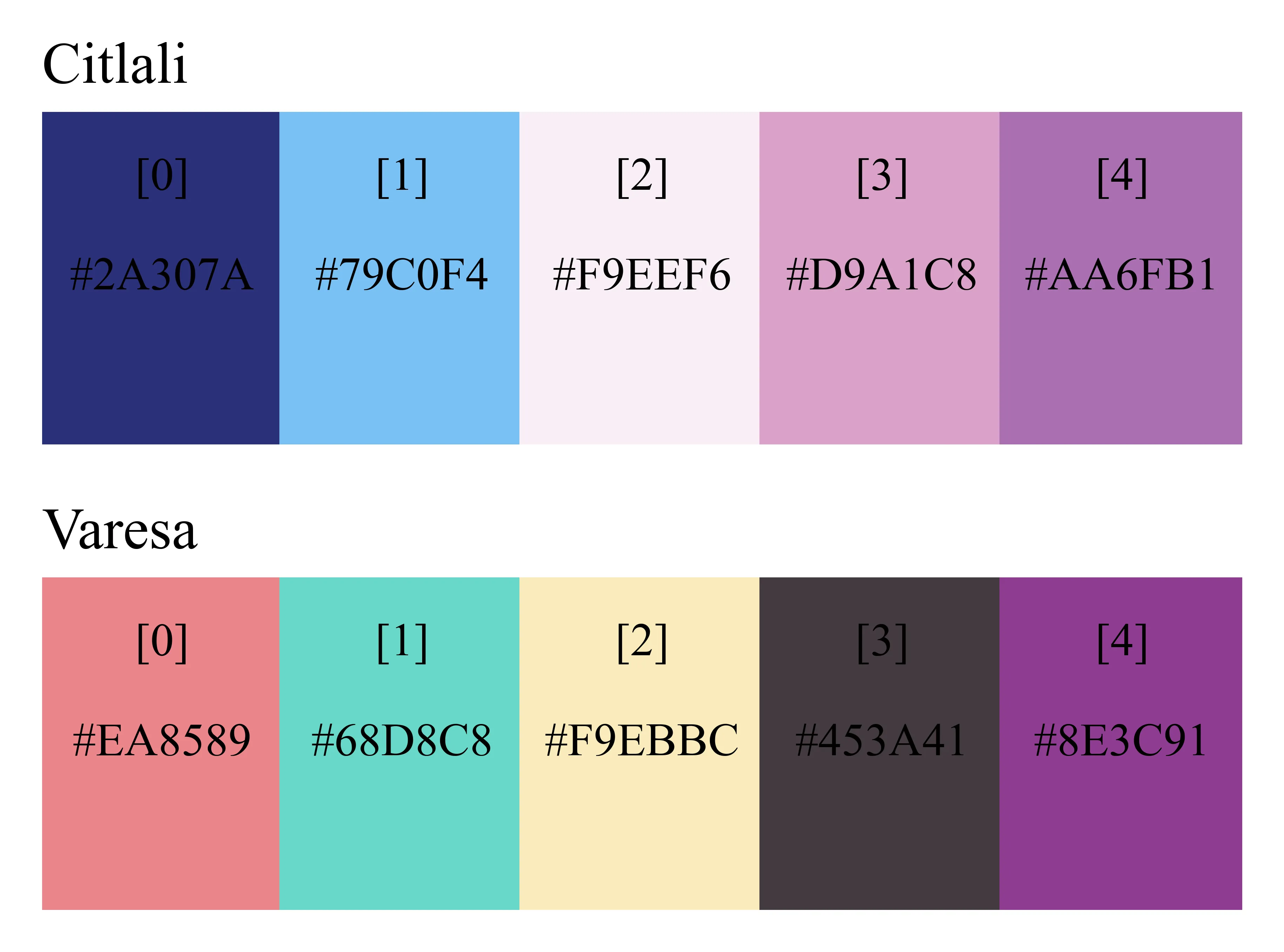 import matplotlib.colors as colorsfrom matplotlib.colors import LinearSegmentedColormap# 创建自定义颜色映射color_Citlali=["#2A307A","#79C0F4","#F9EEF6","#D9A1C8","#AA6FB1"] # https://zhuanlan.zhihu.com/p/16319790673color_Varesa=["#EA8589","#68D8C8","#F9EBBC","#453A41","#8E3C91"] # https://zhuanlan.zhihu.com/p/1889269380099048069cmap_Citlali=colors.LinearSegmentedColormap.from_list("Citlali", color_Citlali)cmap_Varesa=colors.LinearSegmentedColormap.from_list("Varesa", color_Varesa)在jupyter中,直接输入cmap_Citlali或cmap_Varesa,就可以看到颜色映射的效果。