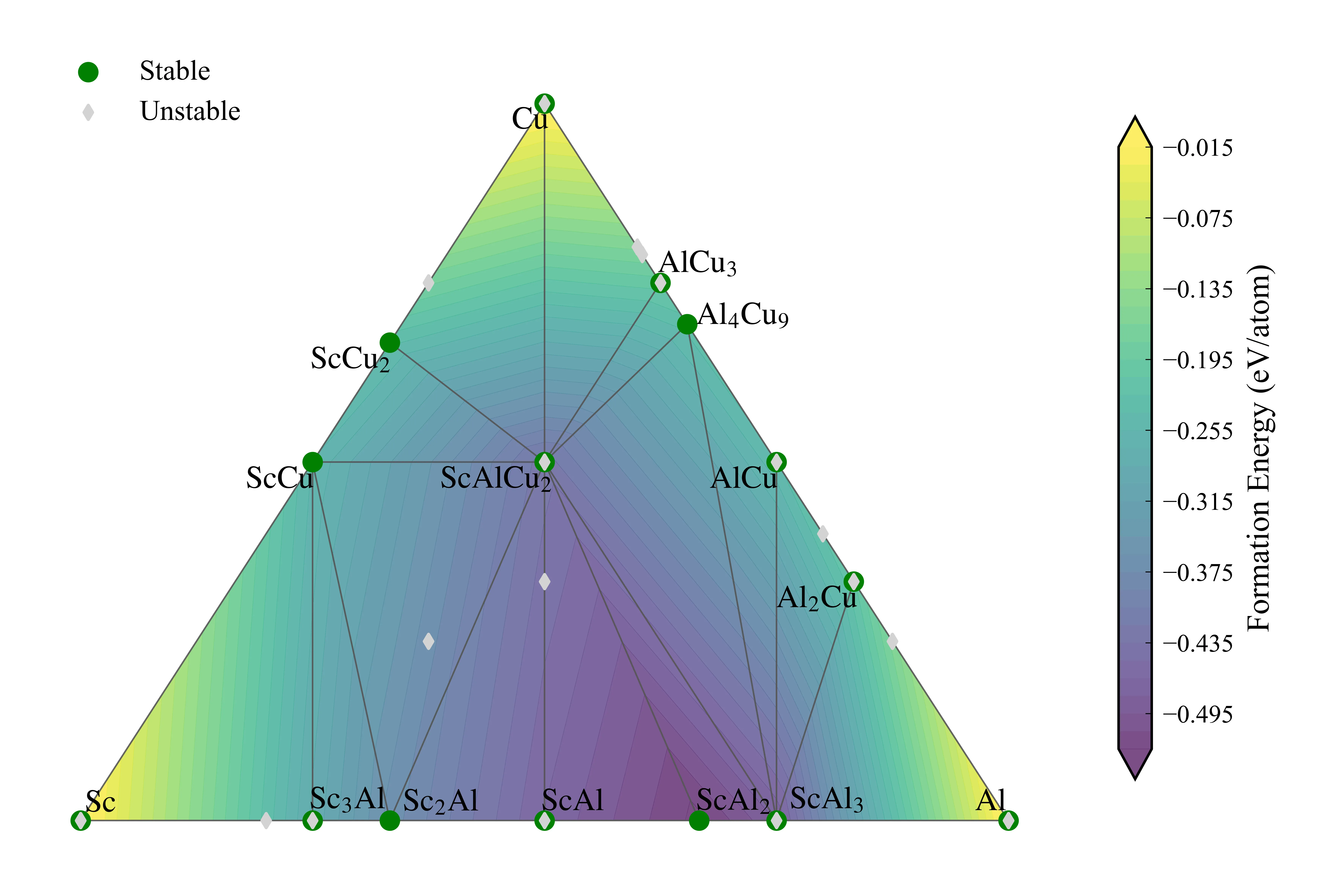 phase_diagram = PhaseDiagram(entries)plotter = PDPlotter(phase_diagram)fig = plotter.get_plot()fig.show()到这里,我们就成功构建了Al-Cu-Sc系统的相图,如下所示。